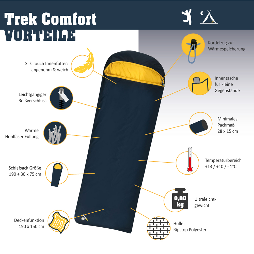 Der Trek Comfort macht seinem Namen alle Ehre, denn er bietet nicht nur Wärme, sondern auch exzellenten Komfort: für Schlaf und Transport. Zusätzlich besitzt seine Außen- sowie auch Innenhülle eine geräuscharme Eigenschaft. Somit kann man sich oder seine Mitcamper*innen nicht mit dauerhaften Rasselgeräuschen stören. Stattdessen kannst du dich gemütlich in deinen Schlafsack kuscheln, dank des geschmeidigen Innenfutters aus Silk Touch.