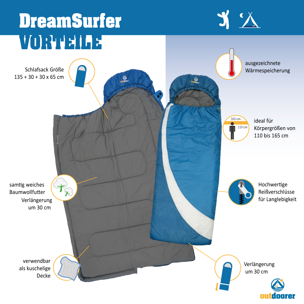 Der DreamSurfer ist der ideale Kinder- und Jugendschlafsack: durch die Reißverschlusserweiterung lässt sich der Kinderschlafsack um 30 cm verlängern und wächst somit mit deinen Kids mit! Der Baumwoll-Schlafsack wärmt die Kleinen im Kindergarten, bei Hüttenwanderungen, Campingurlauben und Zeltabenteuer mit Freunden. Im Packsack eingepackt lässt er sich gut transportieren und ist vor Schmutz geschützt. Mache deinen Kleinen eine Freude und bestelle den DreamSurfer in ihrer Wunschfarbe!