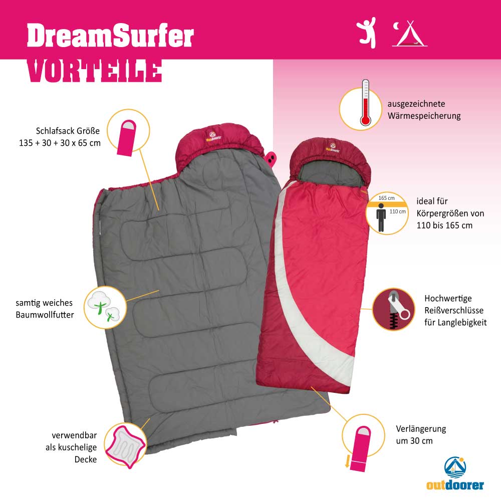 Der DreamSurfer ist mit 100 % Baumwolle gefüttert und sorgt somit für wohlig warmes und kuscheliges Gefühl. Die Hohlfaser-Füllung sorgt für gute Speicherung der Körperwärme und langanhaltende Wärme beim Schlafen. Für die Außenhülle wurde Polyester verwendet – diese ist pflegeleicht und kleine Flecken können leicht rausgewaschen werden. Besonders praktisch sind die leichtgängigen und stabilen Reißverschlüsse, die nerviges Klemmen verhindern.