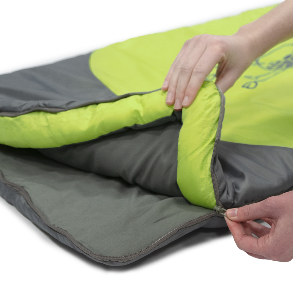 Die Zips sind gut vernäht und problemlos zu bedienen. Dem neuen Besitzer hat der Schlafsack auf Anhieb gefallen. Beim ersten Einsatz im Zelt hat er sich sofort gerne rein gekuschelt. Dass man den Schlafsack auch als Decke verwenden kann, hat sich bei den eher sommerlichen Temperaturen ausgezahlt.