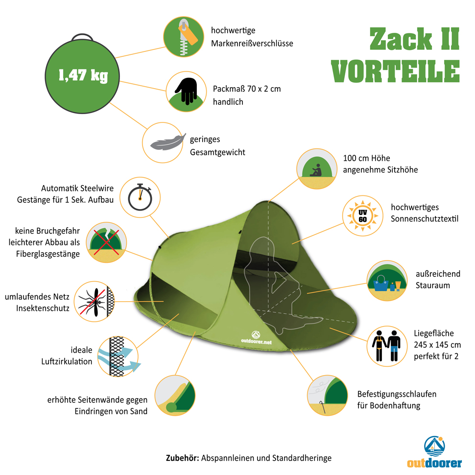 Produktinformationen "outdoorer Pop Up Strandmuschel Zack II - grün, selbstaufbauend, mit Moskitonetz"