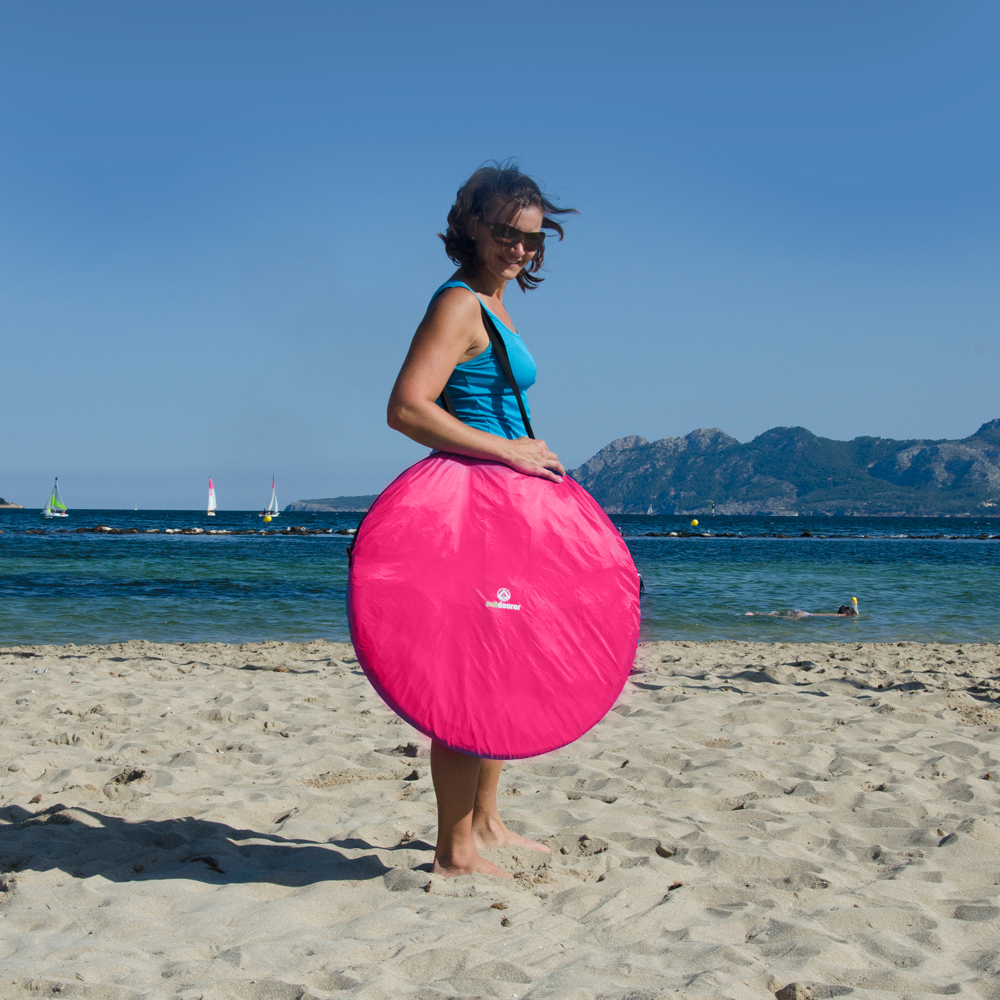 Unsere Kinder haben sich für pink entschieden, weil diese Strandmuschel so ein schönes Licht macht. Für uns Eltern steht natürlich der UV-Schutz im Vordergrund.